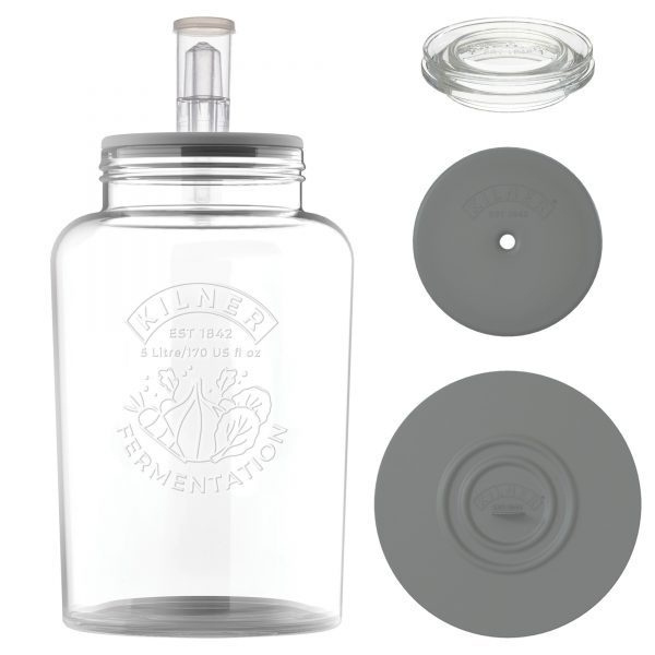 Reilun kokoinen käymisastia, jossa on vesilukko. Purkki vetää täydet 5 litraa, joten voit valmistaa viikon verran hapankaalia yhdessä erässä. Vesilukko päästää kaasun ulos, mutta ilmaa ei pääse sisään (voit testata periaatteen itse kylpyammeessa). Mukana tulevat silikoni- ja lasipainot varmistavat, että kaikki vihannekset pysyvät vedenpinnan alapuolella. Mukana tulee myös pieni englanninkielinen reseptivihko.