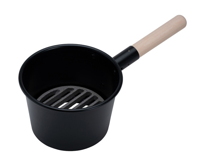 Puukahvan ansiosta astiaa voi liikutella myös kuumana, ja korkea, suora seinämäprofiili pitää hiilloksen kasassa ja ohjaa samalla luontevasti ilmansyöttöä aukon läpi.