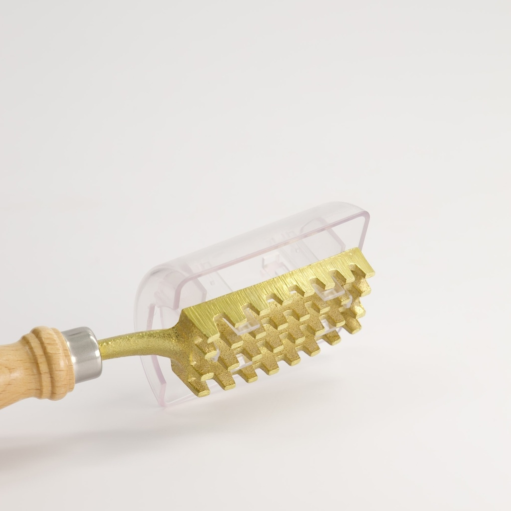 Messinki on kestävää ja korroosionkestävää, mutta sillä on myös tietty paino, joka tekee välineestä kädessä vakaan. Hampaissa on pienet raot, joiden ansiosta suomut kerääntyvät työkaluun sen sijaan, että ne pomppisivat ympäriinsä. Puinen kahva tarjoaa luonnollisen otteen ja on mukava pitää kädessä pidempienkin työskentelysessioiden aikana.