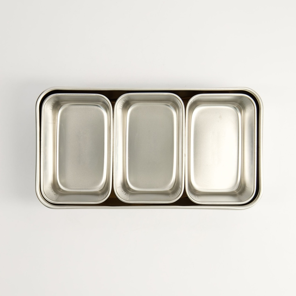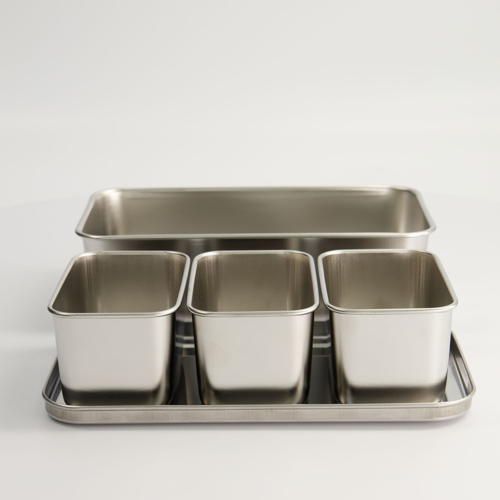 Japanilaiset ruostumattomasta teräksestä valmistetut minilaatikot, joita voidaan käyttää ravintolakeittiöissä, jotta pienet ainesosat pysyvät erillään ja saatavilla ilman, että ne vievät työtason. Kukin insertti on irrotettava, joten se on helppo vaihtaa, pestä ja siirtää sisältöä asemien välillä.
