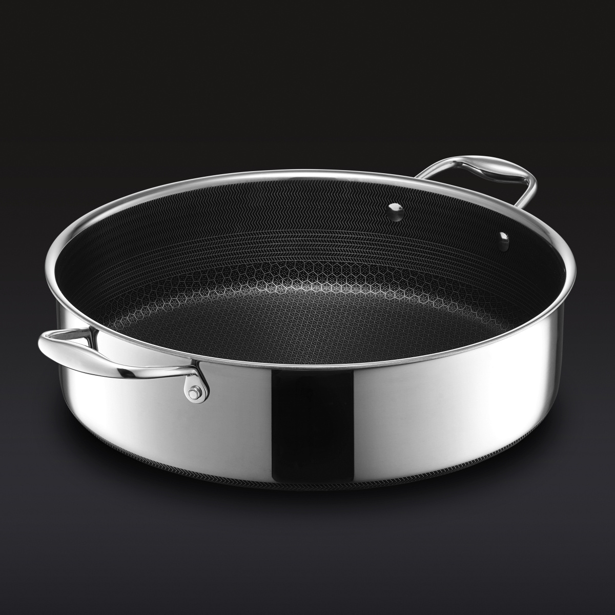 Hexcladin syvä buffetpata lasikannella on hybridipata niille, jotka haluavat samassa pannussa paistaa, paistaa, hauduttaa ja hauduttaa. Runsaan halkaisijan ja korkean reunan ansiosta voit sekä mahduttaa suuremmat lihapalat että työskennellä turvallisesti suuremman määrän nestettä tai öljyä ilman, että sitä vuotaa.
