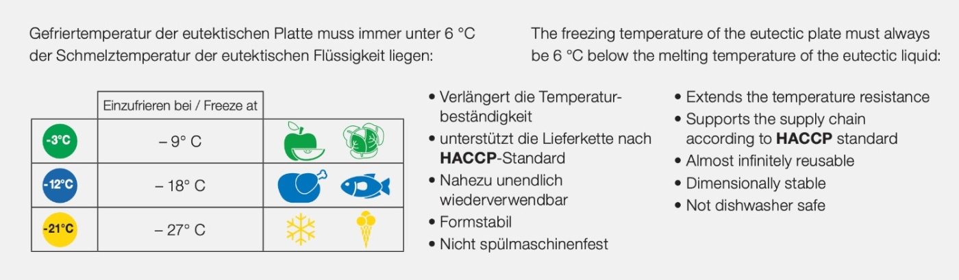 • Kylmäakut polyeteenistä muotoiltuina GN-mittoihin suoraan käytettäväksi Schneiderin kuljetuslaatikoissa. Täyte on formuloitu pitämään lämpötila -12°C:ssa, sopii syväjäähdytetyn valmisruoan, kalan ja äyriäisten sekä pakkasen alapuolella jäähdytystä vaativien tuotteiden kuljetukseen ilman syväjäädytystä. Tuoreiden tuotteiden ja maitotuotteiden kuljetukseen riittää -3°C-versio, kun taas syväjäädytetyt tuotteet kuten jäätelö ja pakasteliha vaativat -21°C.