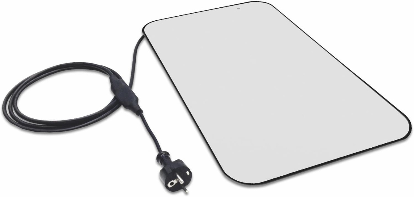 Lämpötilansieto jopa 120°C ja roiskeveden kestävä. Mitat: 480×280×10 mm, paino 1,2 kg. Liitäntä 230 V.