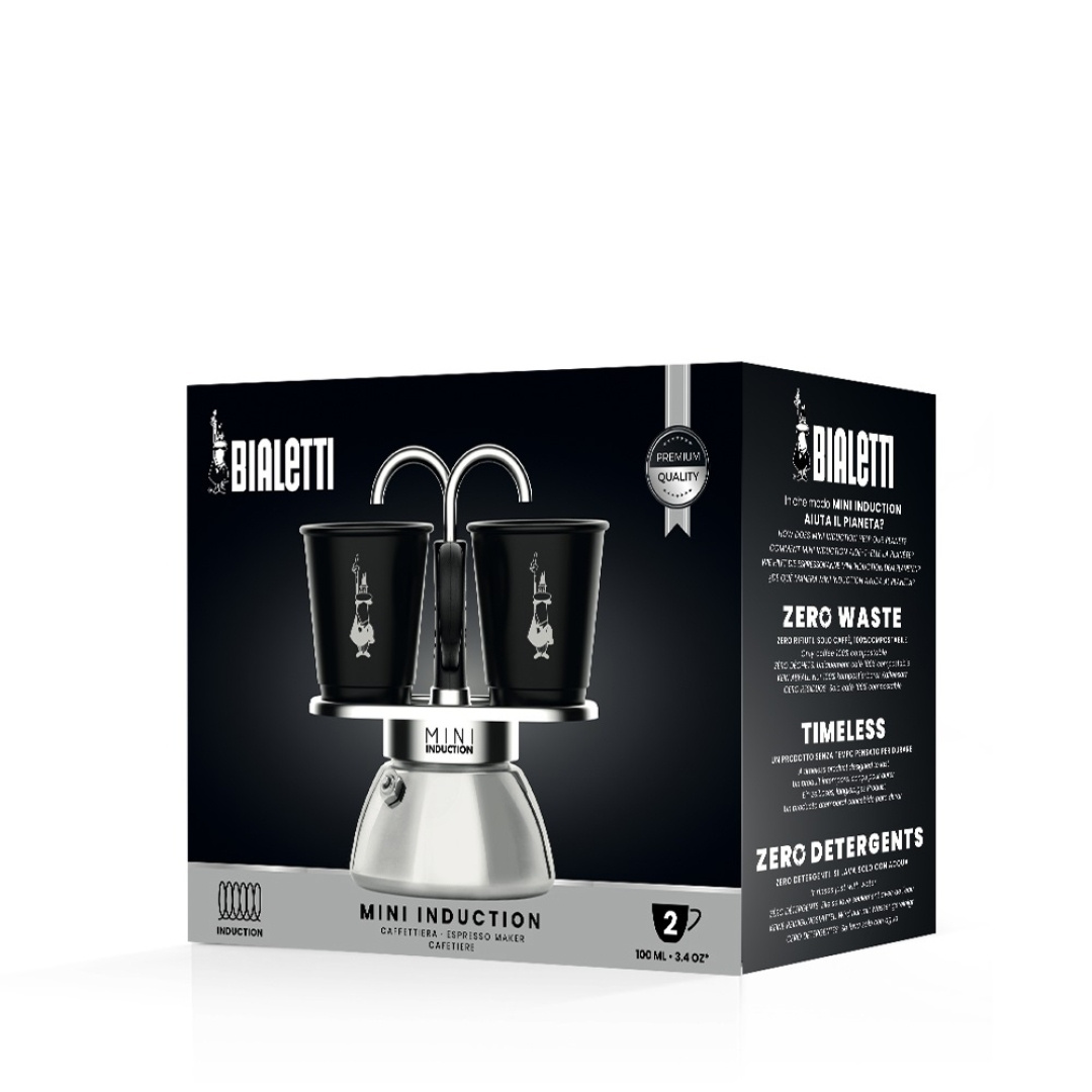 Mukava mokkakeitin, jolla voi valmistaa kaksi espressoa suoraan kuppiin. Malli on nimensä mukaisesti induktio yhteensopiva. Ruuvaa pohja irti ja täytä vettä venttiiliin asti. Täytä kahvilla puristamatta, työnnä kaikki yhteen ja laita liedelle kupit suuttimien alla ja saat pian annoksesi. Kupit sisältyvät pakkaukseen.