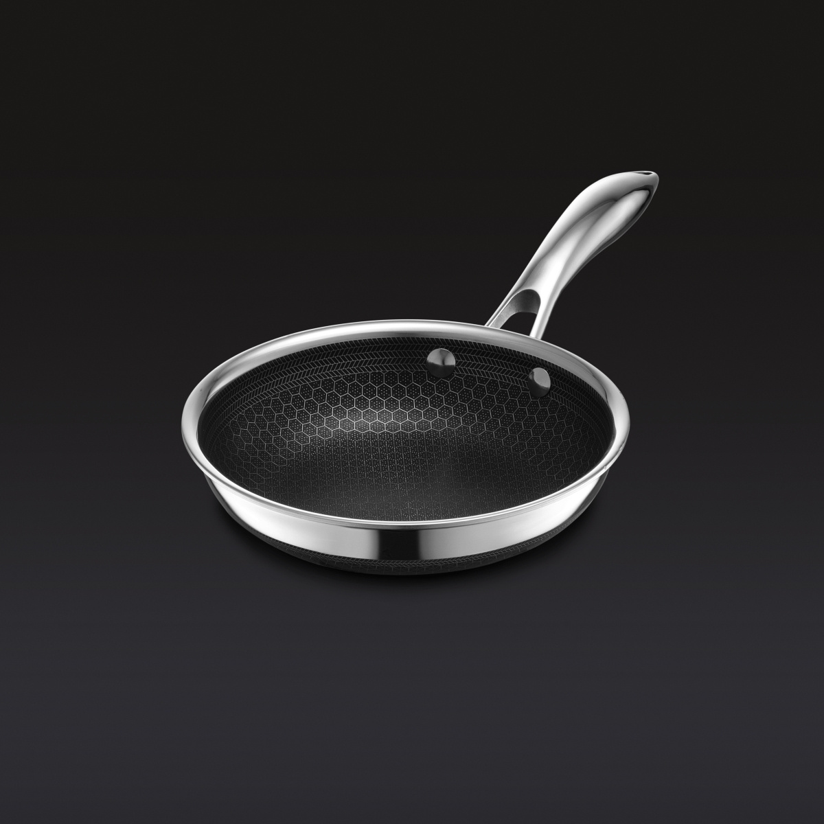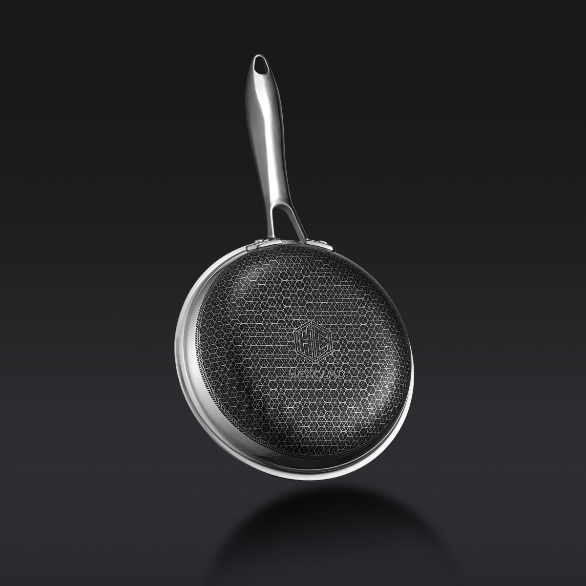 Hexclad-pannu kestää metalliastioita vahingoittamatta pintaa, mikä antaa sinulle maksimaalisen joustavuuden keittiössä. Pinta vaatii vähemmän rasvaa kuin perinteinen teräspannu, ja sen avulla voit työstää kaikkea herkästä kalasta runsaisiin lihapaloihin. Ergonominen metallikahva pysyy viileänä liedellä - mukava ja turvallinen koko ruoanlaiton ajan.