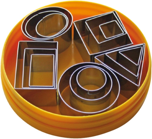 Muottisarja, jossa on 15 geometrista muottia ruostumattomasta teräksestä, korkeus 20 mm, materiaalin paksuus 0,3 mm. Konditoriassa muotteja käytetään fondantin, marsipaanin ja sokeritaikinan leikkaamiseen tarkkoihin geometrisiin yksityiskohtiin. Fine dining -keittiössä ne ovat yhtä lailla kotonaan: huoneenlämpöinen terriini, hyytynyt puristettu kasvislevy, aspic-siivu tai ohut carpaccio leikataan tarkkoihin geometrioihin suoraan lautaselle ilman vapaakäden taitoa. 0,3 mm teräksen terävä reuna antaa puhtaan leikkauksen puristamatta herkkiä valmisteita. Astianpesukoneen kestävät ja pinottavat.