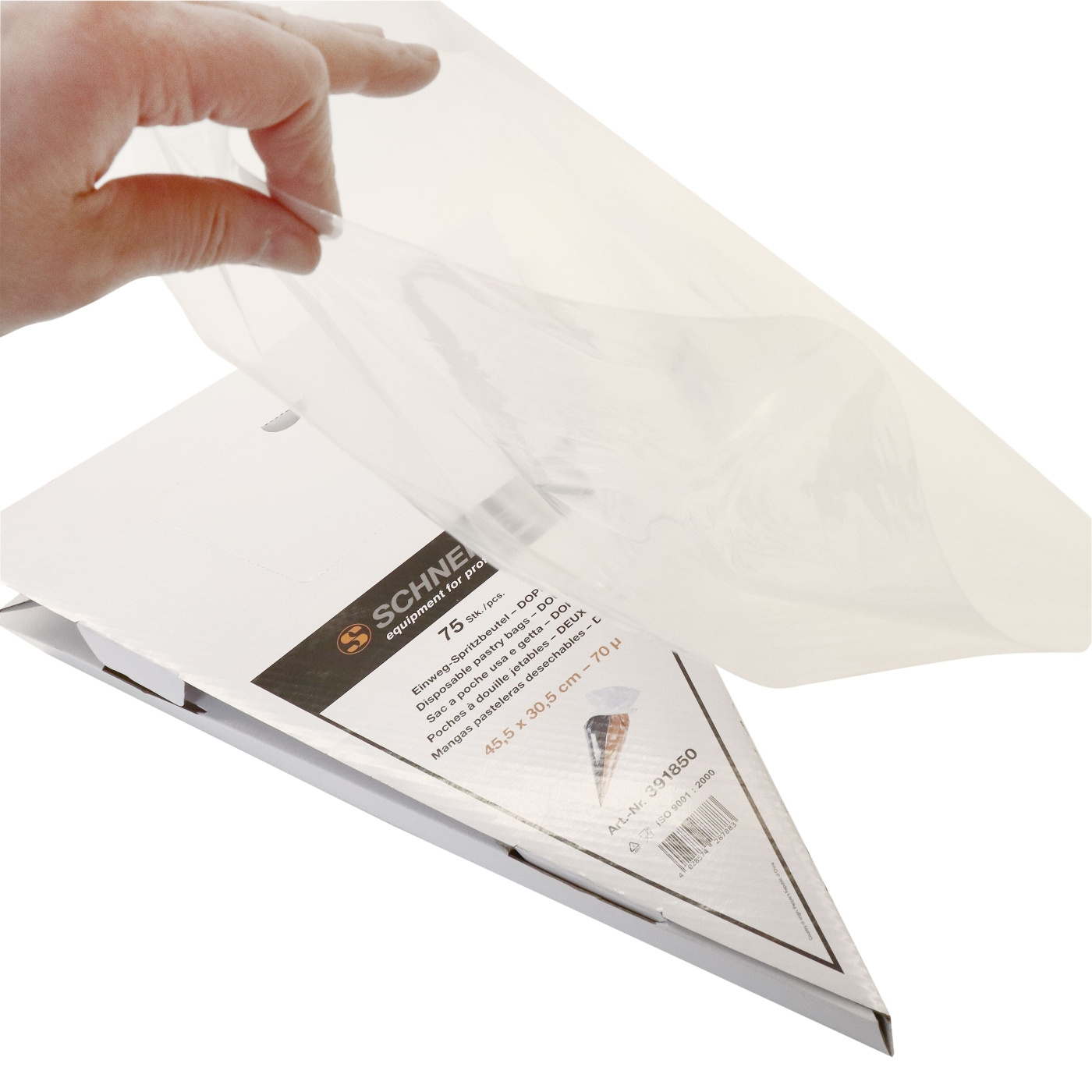 Kaksoispursotettua materiaalia sileällä sisäpinnalla ja korkealla hitsaussauman lujuudella. Kärki on suljettu ja pussia voidaan käyttää ilman suutinta. Läpinäkyvä, nipputettu, 455×305 mm. Pakkaus 75 pussia kartongin ottoaukolla.