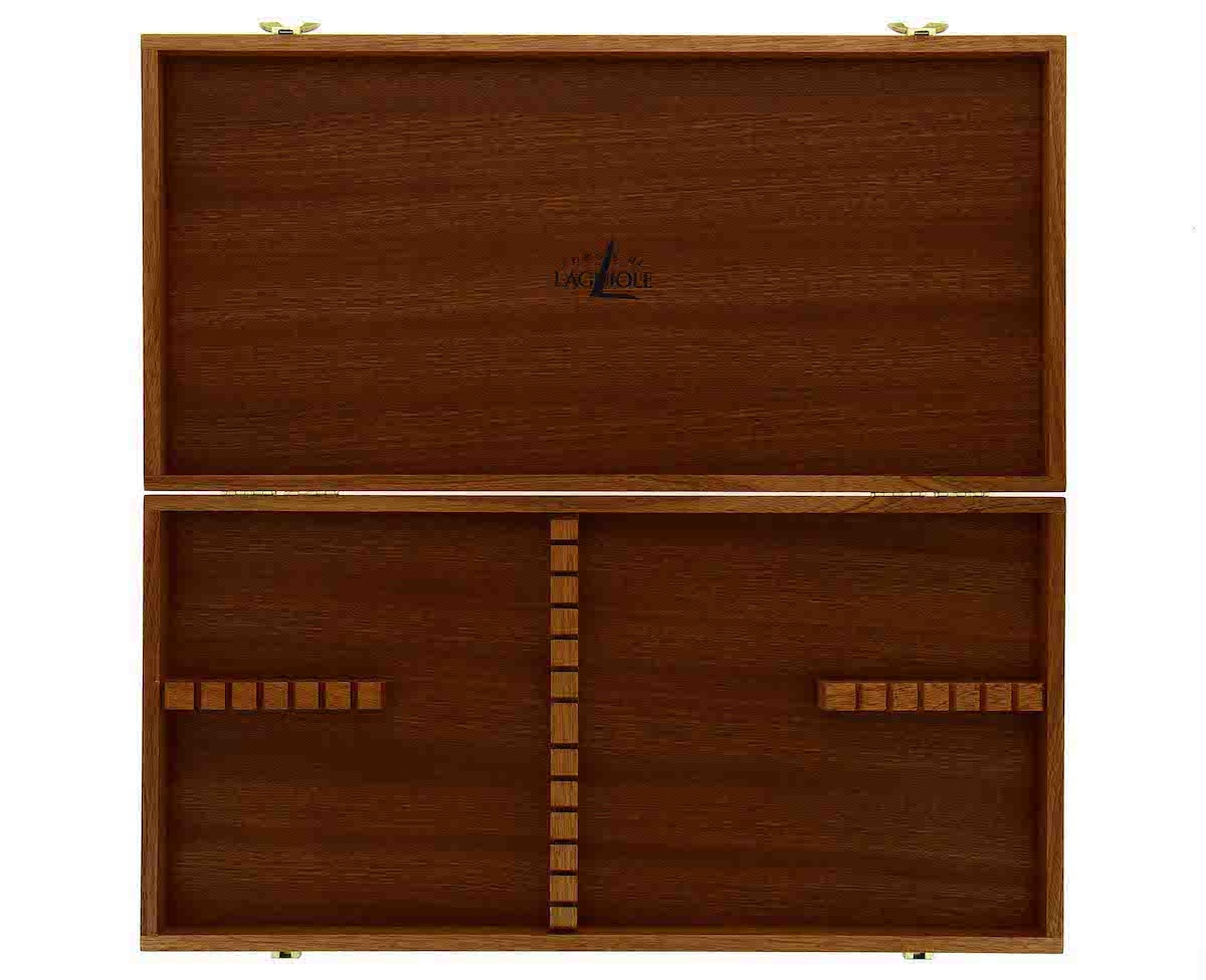 Käsintehty säilytyslaatikko Sapele-puusta (Entandrophragma cylindricum). Sopii täydellisesti 24 ruokailuvälineen säilytykseen. Valmistettu 24 erityistä Forge de Laguiole -ruokailuvälinettä varten: 6 ruokaveitsiä, 6 ruokahaarukkaa, 6 ruokalusikkaa ja 6 jälkiruokalusikkaa. Toimitetaan ilman ruokailuvälineitä.