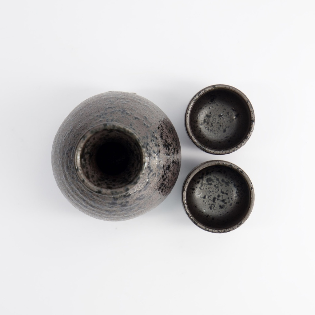 Täydellinen sake-setti, joka koostuu tokkurista (karahvi) ja kahdesta chokosta (kupista). Setti on valmistettu kivitavarasta, jossa on tumma, elinvoimainen lasite, jossa vaihtelevat harmaan, mustan ja ruskean sävyt - tämä on japanilaisen wabi-sabi-tyylin ilmaus, jossa jokaista vaihtelua pidetään merkkinä käsityön aitoudesta.
