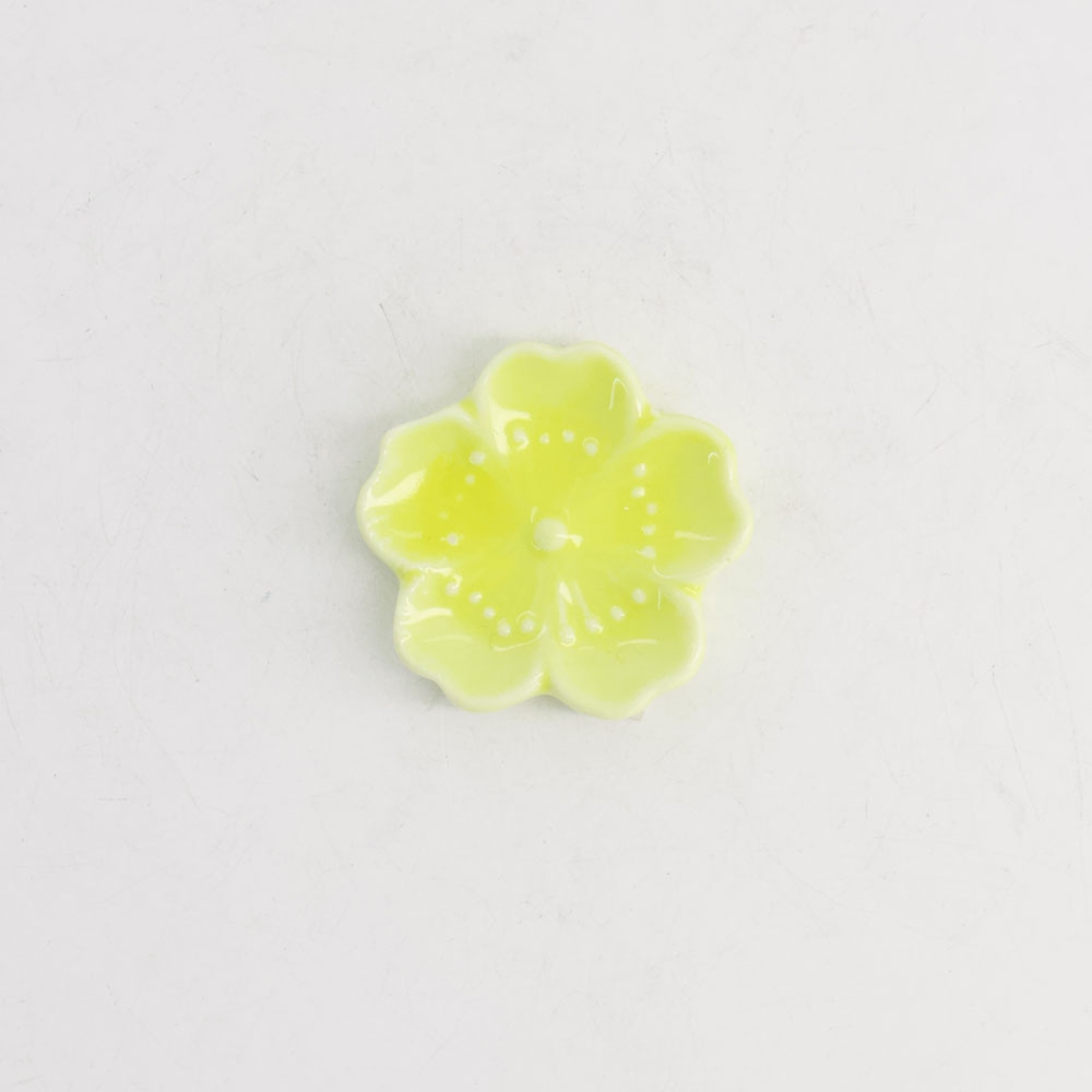Tämä posliininen syömäpuikkotuki, hashioki, on muotoiltu sakuran, kirsikankukan, näköiseksi, joka peittää Japanin joka kevät värimereen. Pehmeän keltainen lasite antaa raikkaan ja lämpimän sävyn, joka piristää pöytäasetelmaa ja antaa leikkisän mutta tyylikkään vaikutelman.