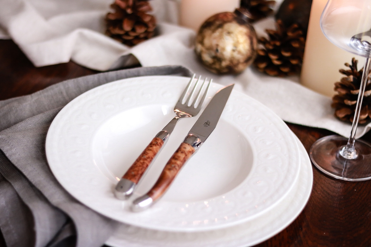 Täällä ei jätetä milliäkään laadun varaan, vaan jokainen pienestä tehtaasta lähtevä ruokailuväline on hienosäädetty yksityiskohtien tasolla. Ranskalaisesta T14-ruostumattomasta teräksestä valmistetut terät taotaan paikan päällä tehtaalla 1000-asteisissa uuneissa. Puu- tai eläinkahvat leikataan ja kiillotetaan käsin kokeneiden puukkoseppien toimesta, ja terän istuvuus on taivaallinen. Kaikki on täydellistä! Nämä ruokailuvälineet kruunaavat kotisi tai ravintolasi, ja niitä on ilo käyttää joka kerta!