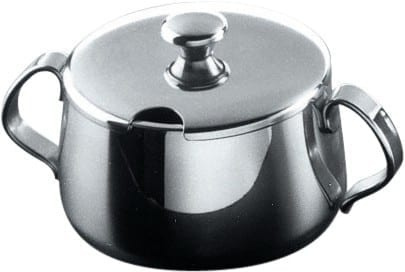 Kulho kannella. Korkeakiiltoista 18/10 terästä. Suunnittelu: Ufficio Tecnico Alessi.