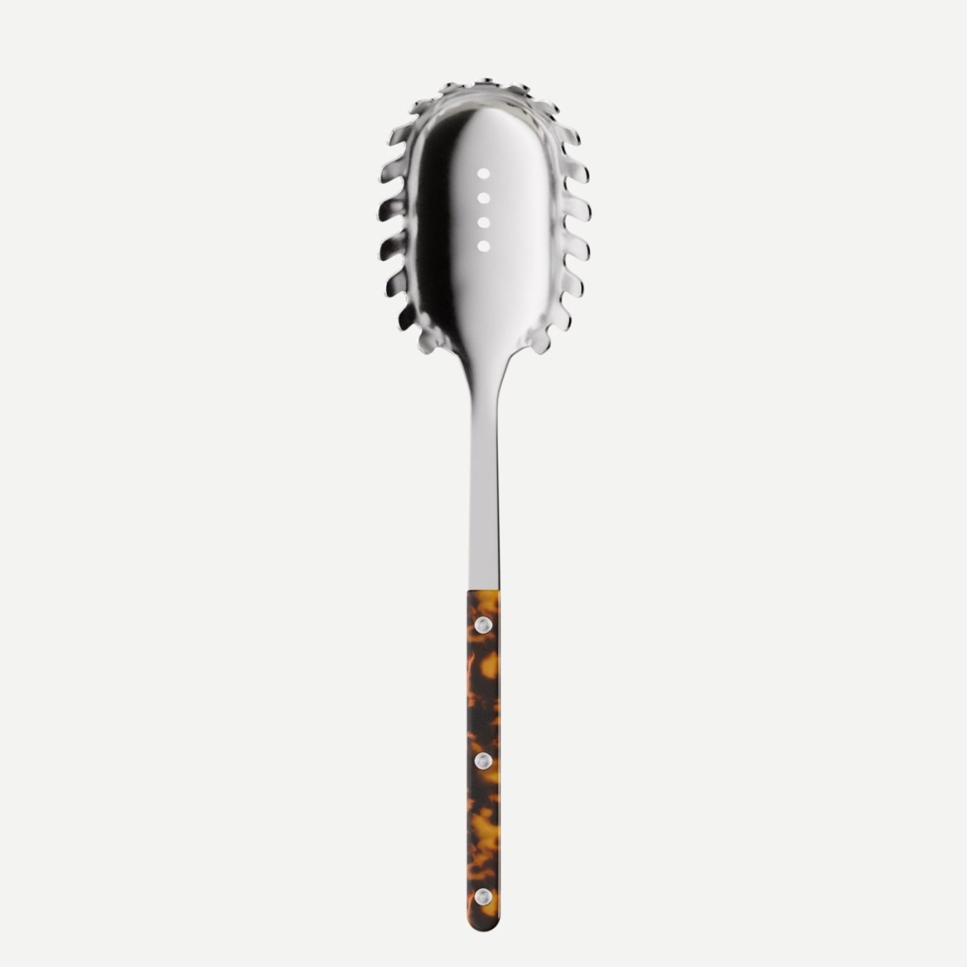 Klassinen spagettikauha, jolla on selkeä luonne ja luotettava toiminta. Muotoilussa on otettu huomioon sekä muoto että toiminta - pyöreä siivilä ottaa pastan kiinni vahingoittamatta sitä, ja kahvasta saa pitävän otteen myös kiireisessä keittiössä. Valmistettu 18/10 ruostumattomasta teräksestä ja Bistrotin nylonkahva. Tarjoiluastia, joka sopii yhtä hyvin maalaistyyliseen bistroon kuin pastaa rakastavaan kotiin. Tyylikkäät kahvat ovat tässä kilpikonnakuvioiset ruskean sävyissä.