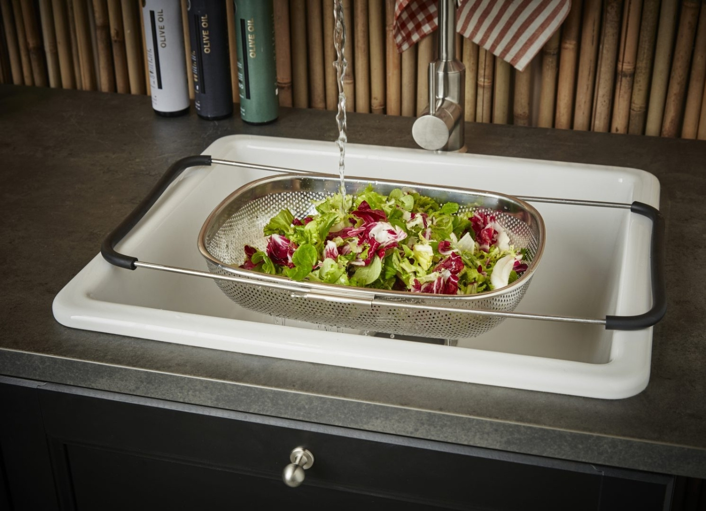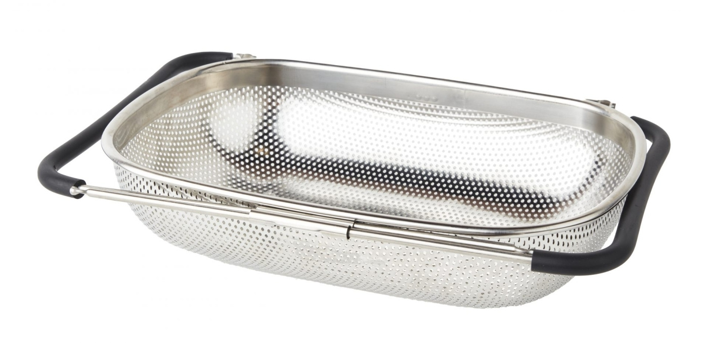 "Käytännöllinen säädettävä siivilä, joka sopii kaikkiin lavuaareihin. Kätevä pastan kaatamiseen, salaatin huuhteluun tai perunan kuorintajätteiden keräämiseen kuorittaessa.