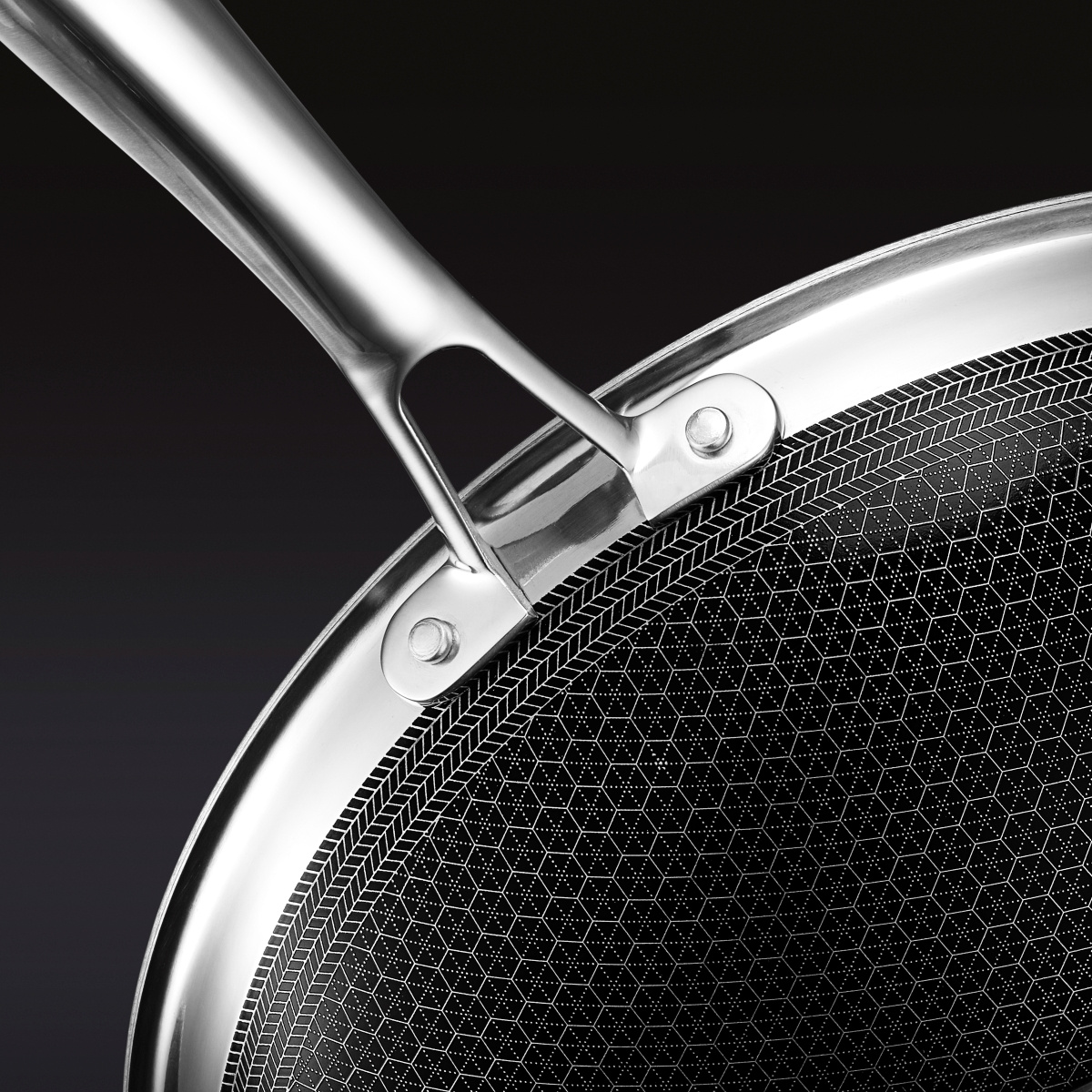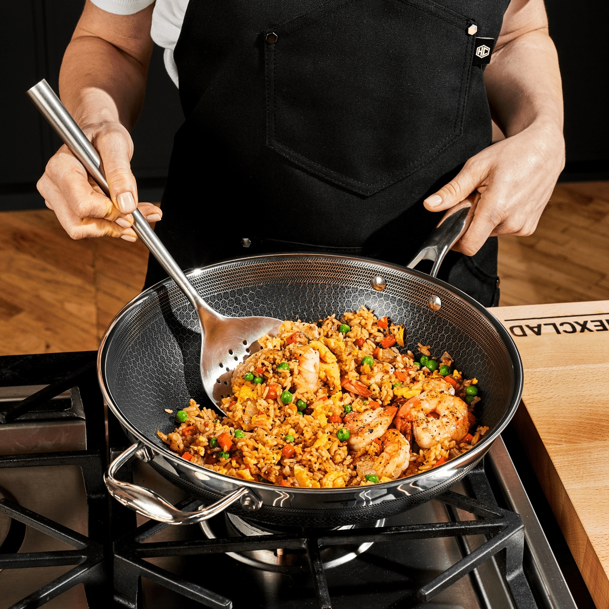 Hexclad Wok 30 cm on wokkipannu, jolla voit hallita täysin lämpöä, liikettä ja makua - se sopii täydellisesti nopeaan paistamiseen, vihannesten ja lihan paistamiseen tai aasialaisvaikutteiseen kasteluun. Leveä, tukeva pohja ja hieman kaltevat reunat tarjoavat tilaa sekoittamiseen, ainesten sekoittamiseen sekä kastikkeen ja lämmön kanssa työskentelyyn.